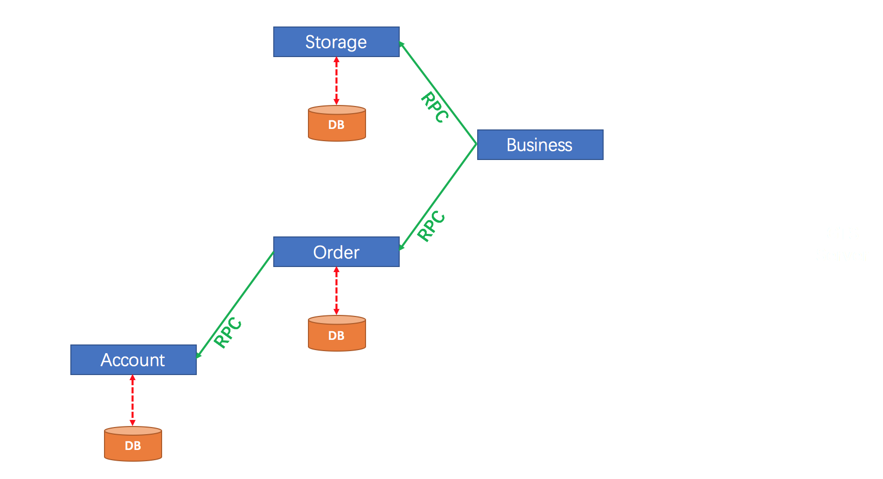 首先引入,分布式事务中常用例子,一个电商场景中用户购买商品,涉及仓储服务,订单服务,账户服务。